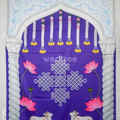 Transform your pooja space into a sanctum of divine elegance with this stunning satin backdrop featuring **digitally printed Pichwai Thoranam motifs** in regal violet hues.