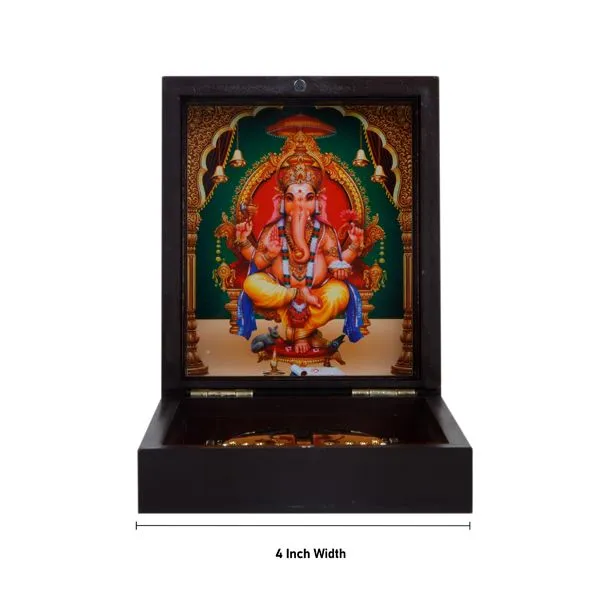 The Puja Box itself is thoughtfully designed, combining aesthetic appeal with practicality. It is crafted from premium materials, ensuring durability and longevity. The box features intricate carvings and embellishments, depicting Ganapati in full grandeur.