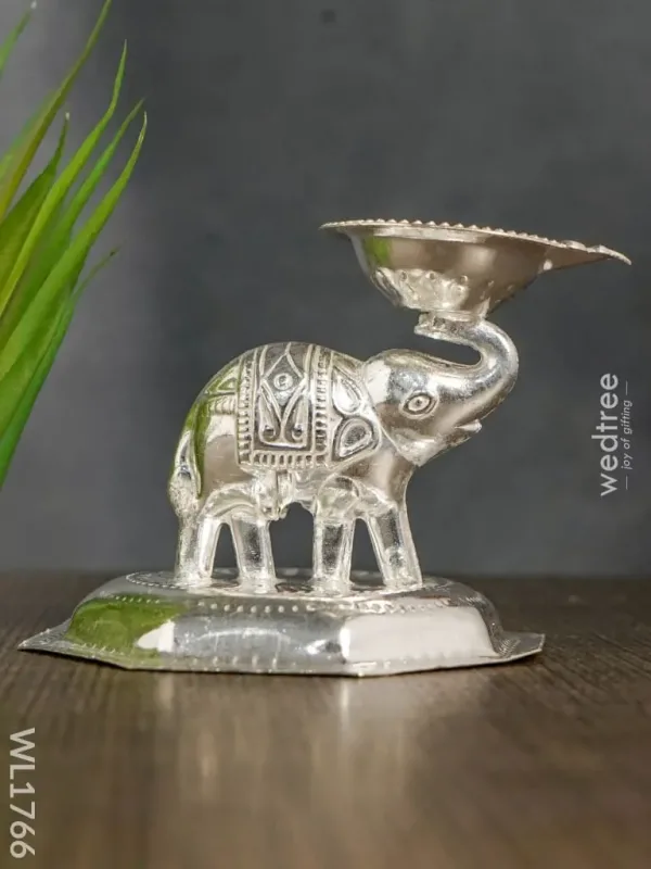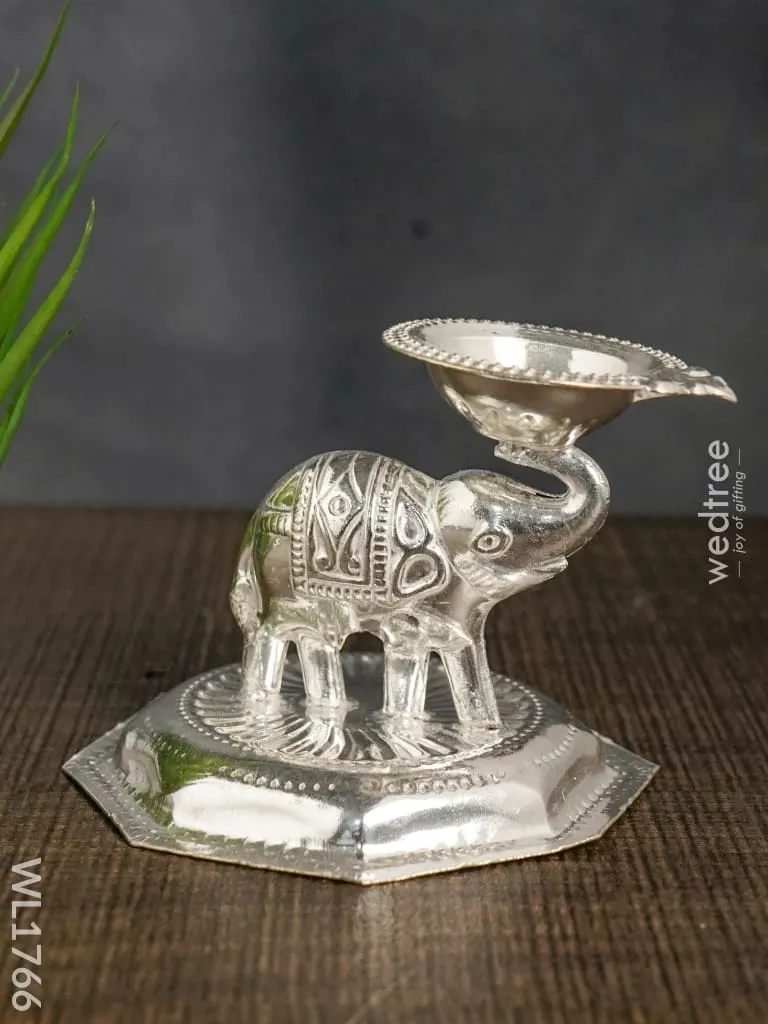 It features an elephant supporting the diya with its trunk and is mount on a round base plate.