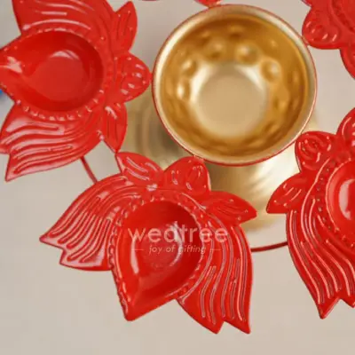 The Metal Urli with Lotus Diya is a stunning decorative piece that combines the elegance of a traditional Urli bowl with the charm of lotus-shaped diyas.
