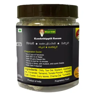 KandathippiliGarlic Rasam powders. Just fry 2 pcs of tomatoes, add 500 ml of water and allow to boil. Add 25 grams of Rasam powder and allow to boill for 5 minutes. Saute with Mustard, curry leaves and Urid dall in Ghee. Garnish with coriander leaves. Your favourite rasam is ready to serve.
