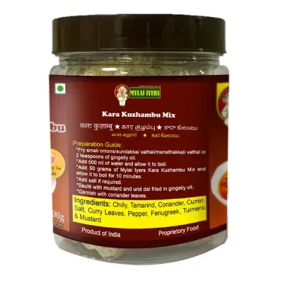 Fry 250 grms of Small onion, one Drumstick in 2 tbsps of oil. Add 500 ml of water and allow to boil. Add 50 gms of Kara Kuzhambu Powder and allow to boil for 10 Minutes to semi solid gravy consistency.. Saute with Urid Dall, Mustard and Curry leaves. Garnish with coriander leaves. Your favourite Kara Kuzhambu for your lunch is ready to serve.