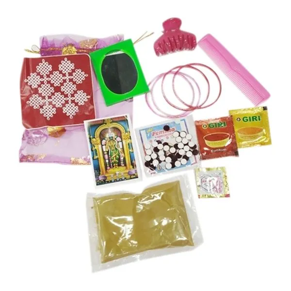 – This Navarathri Pooja Set Small is an all-in-one essential that contains Hindu traditional gifts (glass bangles, bindi packet, comb, mirror, turmeric & kumkum, god image, kajal, henna, kolam).