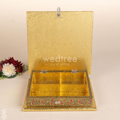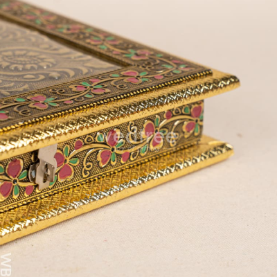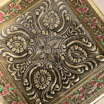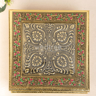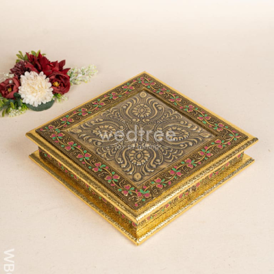 Crafted to hold an assortment of dry fruits, sweets, or small gifts, the spacious 10×10 inch design makes it ideal for Diwali gifting, wedding favours, corporate hampers, or devotional offerings. The antique look and tactile detailing elevate its appeal, making it a keepsake your recipients will treasure long after the festivities.