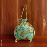 Too good is the design for its beautiful adorning with beaded handle and embroidery works. There are layers of golden embroidery on velvet fabric adorning along the bottom of the bag. The Potli Bag design will serve as an ideal choice of Return Gift for the luxury wedding. There are alternately arranged golden beads. Large and tiny beads arranged close to each other form the gorgeous handle.