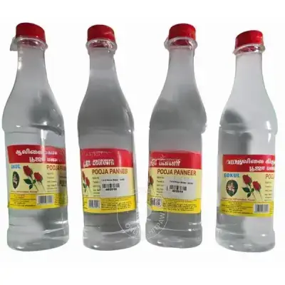 Introducing our premium rose water. Rose water is traditionally used for Abhishekam during pooja. It has a pleasant, soothing fragrance which is believed to be loved by the celestial deities. Beyond its spiritual significance, rose water has many health benefits. It is widely known for its anti-inflammatory properties, eliminating any irritation. It is also a powerful antiseptic that helps fight and prevent infections, or heal burns and cuts. To top it all off, rose water is an essential beauty product, and is well known to reduce the redness of the skin. Enhance your pooja, your health, and your beauty with TSR Rose Water today. Buy now.