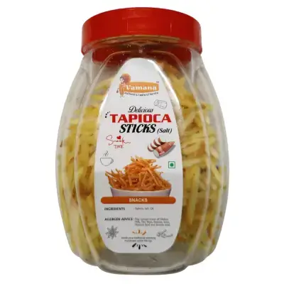 Salted tapioca sticks are a classic South Indian snack made from cassava root, known locally as kappa or maragenasu. The preparation begins by peeling and slicing fresh tapioca into slender sticks, which are then sun-dried to remove moisture and enhance their crispiness. Once dried, the sticks are deep-fried in hot oil until they puff up and turn golden brown. A light sprinkle of salt is added immediately after frying to bring out the natural, earthy flavor of the tapioca.